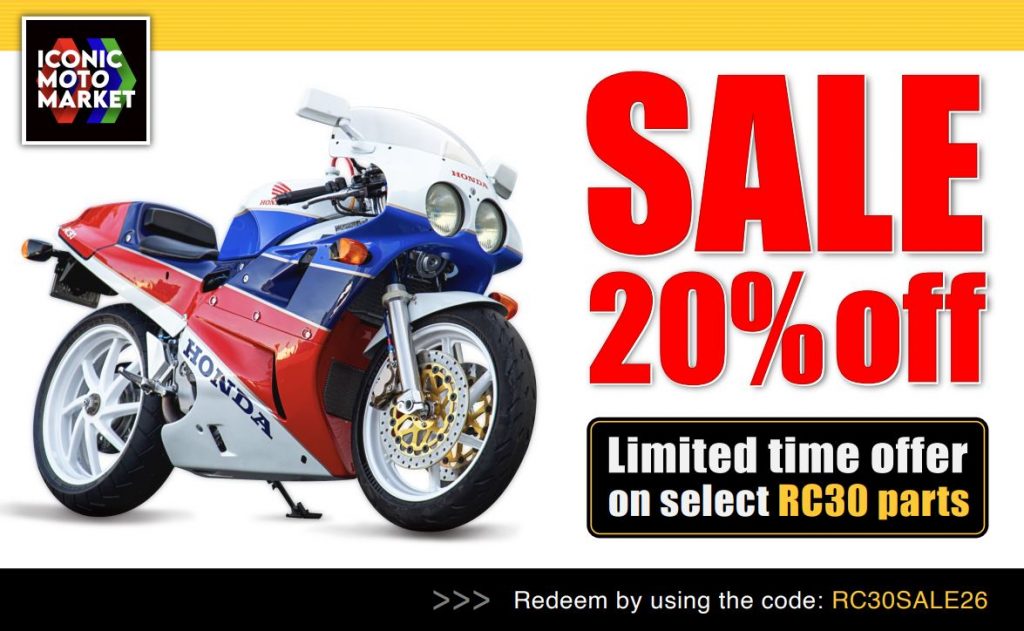 We don’t just sell Iconic Motorbikes like the RC30 – we support them with rare parts, too! Over at Iconic Moto Market we’ve got some great RC30 parts and we’re currently offering 20% off with the code “RC30SALE26”.