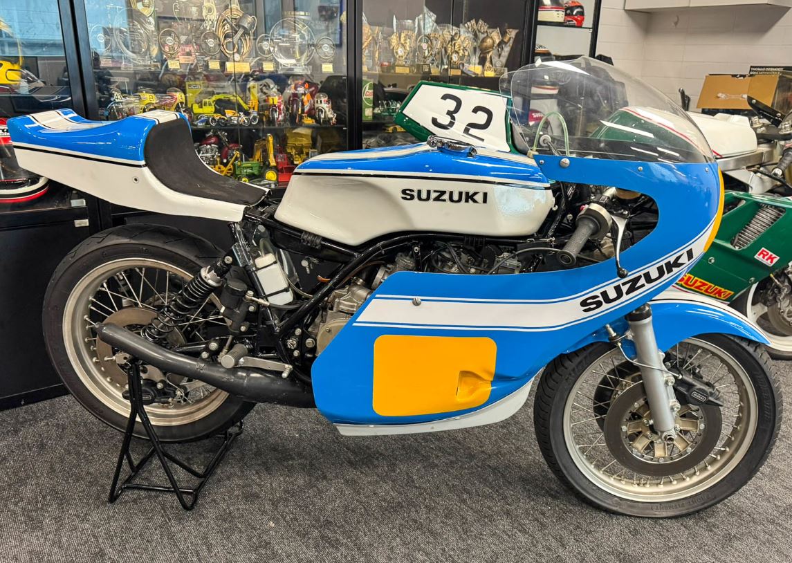 Otherwise, this bike is very original and number 15 of 17 produced. This model was produced just before the Suzuki RG500 square 4 cylinder race bike was made available in limited numbers. All the European Factory Teams such as Texaco in the UK and Gallina in Italy ran them in the world championships as well as national and international race meetings until all the RG500’s were available.”