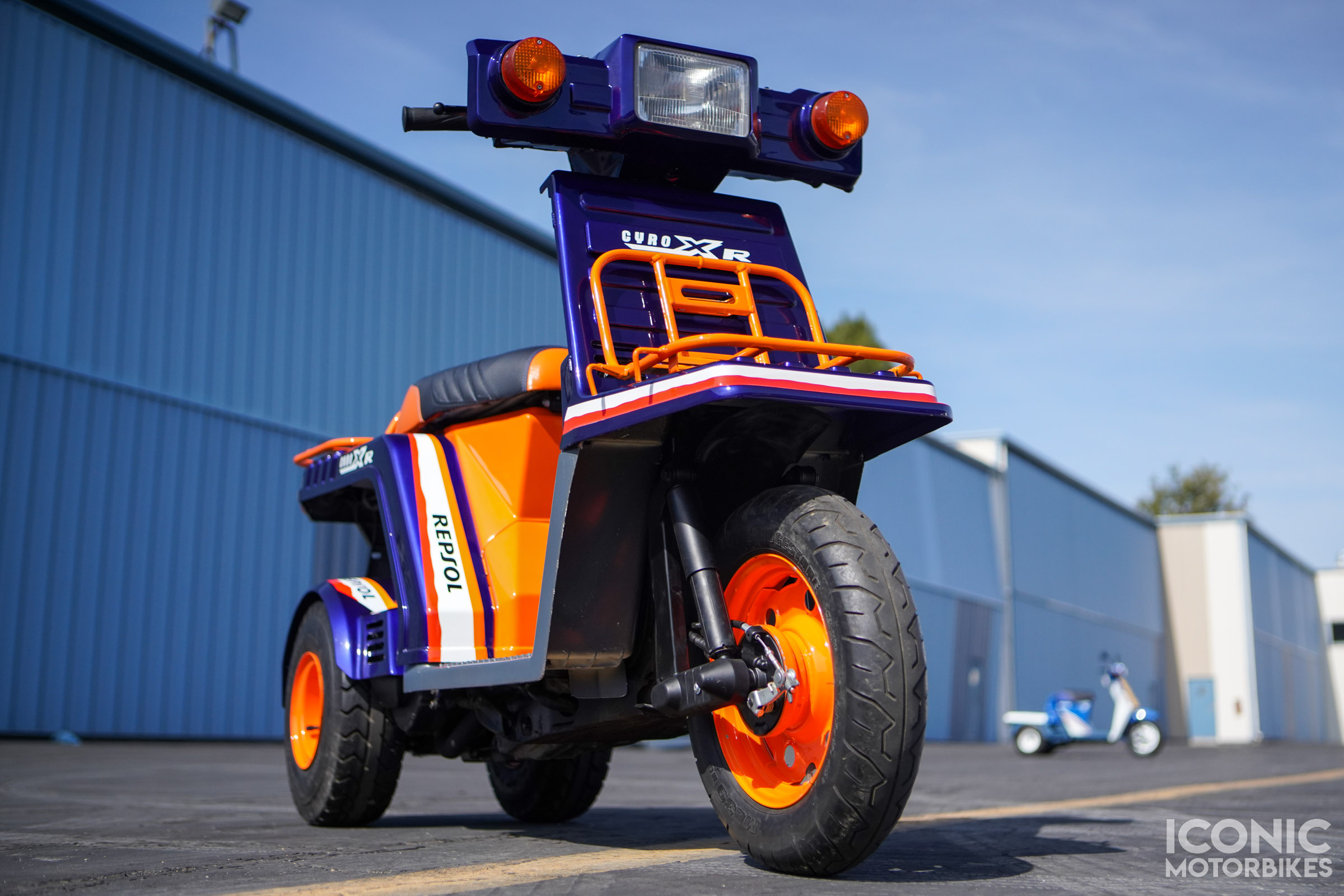 In the U.S. the little runners were only (officially) sold from ’84 to ’86 (Canada got it in only ’84). These three-wheelers allow the body to lean up to 40 degrees compared to the rear axle. This allows for stability when cornering at speed, without losing a scooter’s traditional low-speed stability.