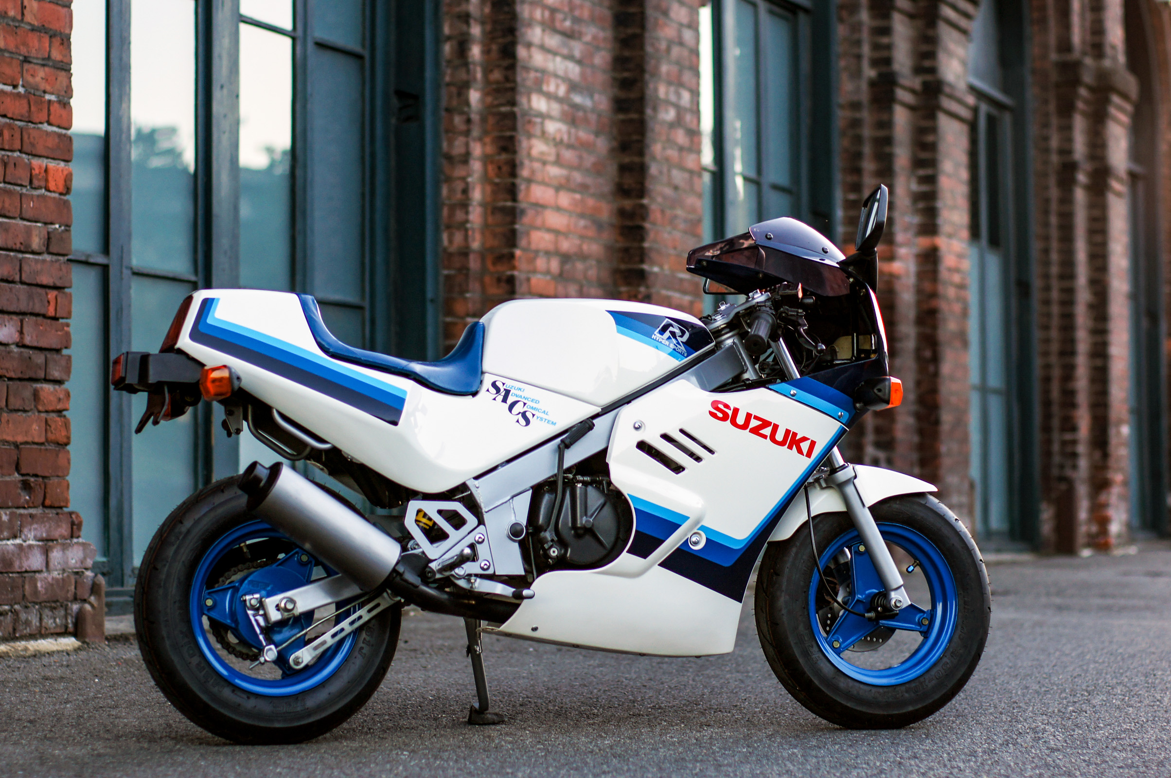 In the 80s, motorcycle manufacturers were attempting to reach new riders by developing smaller size toys. Honda had the Mini Trail, Kawasaki had the KV, and Yamaha had a street option with the YSR. Suzuki had the RV50 for the dirt as well as a full-faired baby sportbike, the RB50 GAG. The RB, released in 1986, featured 4 different liveries: red/white, a grey/white tribute to a bomber plane, a pink “Little Racing” livery complete with a few rabbits, and a blue/white replica of its bigger GSX-R brothers.
