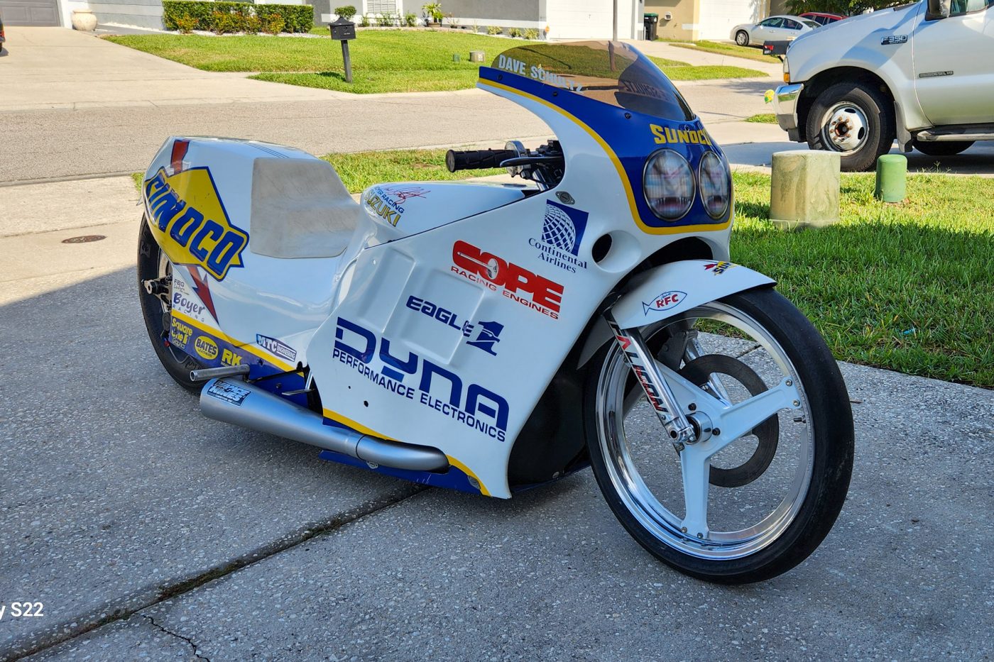 This bike was sold at an auction at Race Rock restaurant in Orlando Florida who called this a Dave Schultz race used bike along with his race used suit and helmet. The seller states “this is a real prostock chassis but has one or two slight differences from photos of the 1994 race winning bike. Ultimately this bike was likely owned by Dave and made into a replica of his race winner then was donated to Race Rock restaurant who subsequently sold it at the 2007 auction along with his actual race suit and helmet. I don’t have any paperwork to ensure the authenticity of the bike but it’s a spot on replica for his actual race bike. The suit sold for $1,500 and the bike went for $22k”
