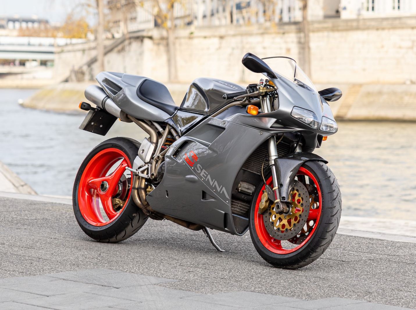 Built as a fund-raiser for the late Ayrton Senna’s namesake foundation, Ducati took just under 1,000 of their standard 916 two-seaters (known as the biposto), and added carbon fiber in a few choice places – like the clutch cover, front fender, exhaust pipe insulation panel, and mudguard. It combined a Strada-spec engine (minus the posh Pankl rods) and SP chassis (Öhlins shock, cast-iron, fully-floating Brembo discs and braided brake hoses), plus you also got one of the coolest paint schemes to ever grace a Ducati – metallic gray with red wheels, and multiple Senna decals. It is one of the rarest 916s ever made.