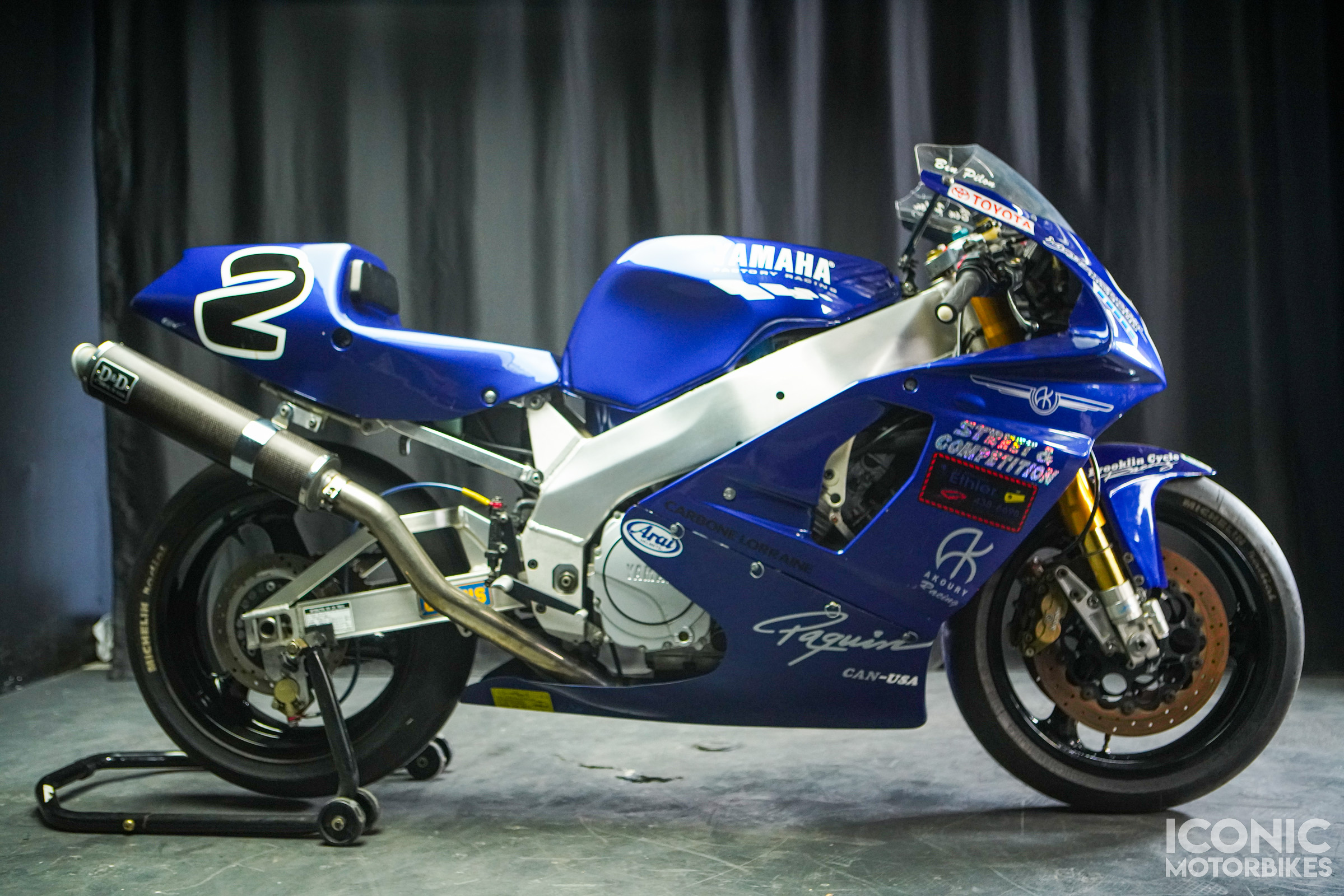 This example was frame swapped and has no VIN stamp on the aftermarket frame. The seller states “This is a race bike that I purchased from Ben Pilon when he was crewing for Pascal Picotte. I have never raced it. This is an SP model so it has the adjustable swingarm pivot and removeable rear subframe etc.”