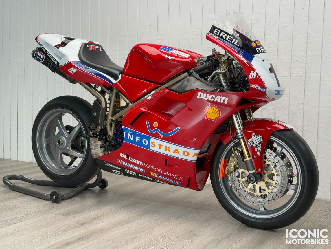 It was almost identical to the 916, sharing everything from styling to even the majority of the bottom end of the engine, and the slight sacrifice in peak horsepower paid off in even better handling thanks to the reduced weight. We could talk more about the stock bike but that wouldn’t apply in this case, as it was heavily customized early in its life to become a Troy Bayliss race replica!