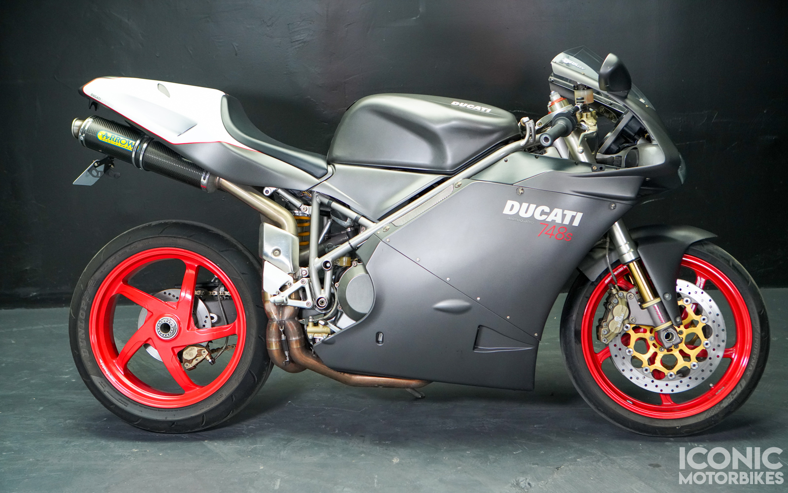 Just 250 examples were built, 200 of which were exported to the US. They were only available as a monoposto. As Ducati put it in a period brochure, “the 748S is packed with normally expensive features found only on full race bikes. The latest fully-adjustable Showa forks with TiN anti-friction treatment are matched with a rising rate rear suspension with damping handled by a fully-adjustable Showa rear shock. Light-weight Marchesini wheels and high performance tyres complete the “S’ model. And new for this year [2002], the 748S is available in our most radical colours – titanium grey with red wheels.”