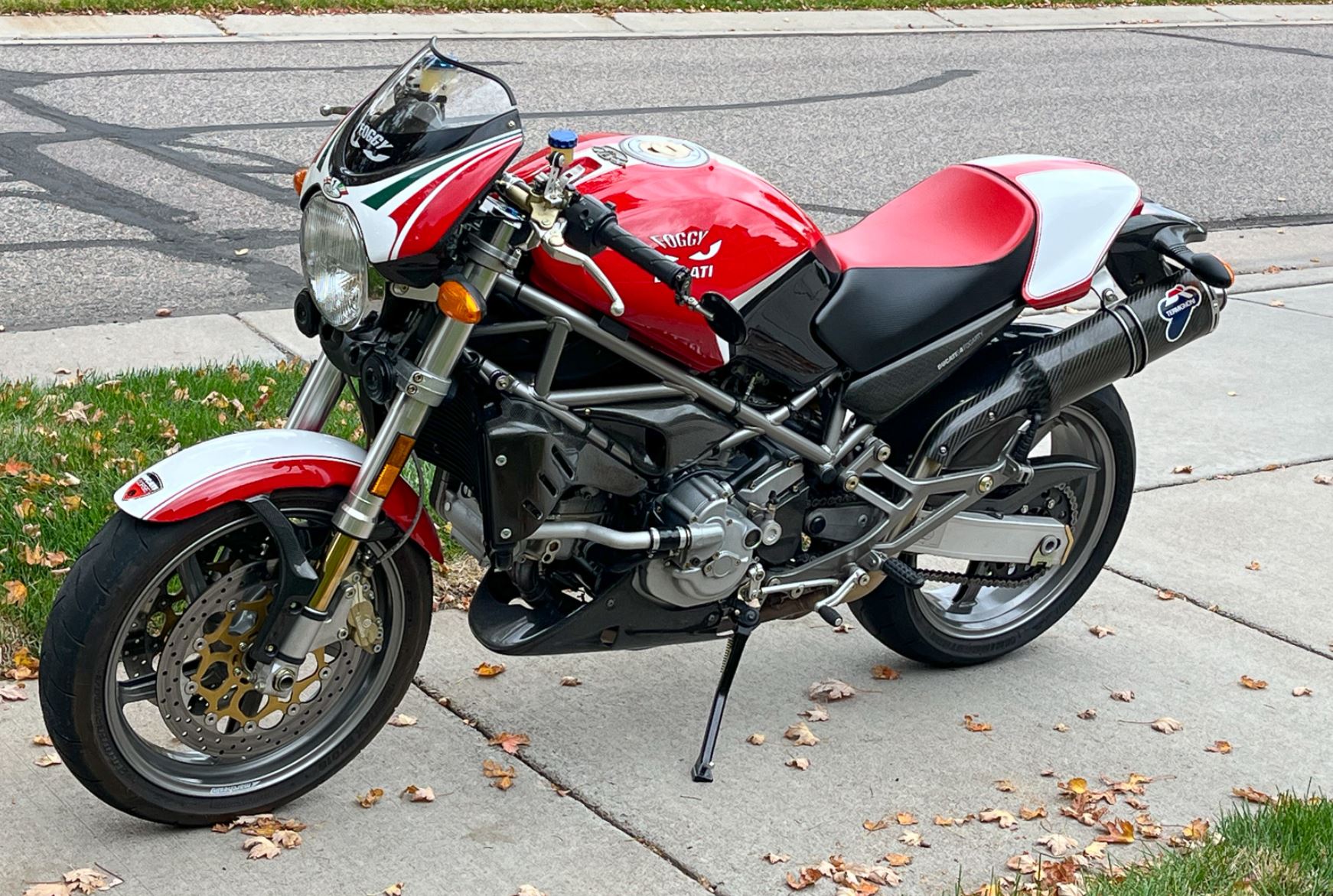 The seller acquired the bike in March of 2009 from the original owner in Seattle, Washington. “Just not riding it..covered in garage. Never been in rain. Have all original parts that got replaced to make it “Foggy” at dealership delivery…exhaust, paddock stands, Foggy bike cover, mirrors, keys, owners manual, plastic that was replaced with carbon, boxes that came with accessories. I wanted a unique Ducati, only 300 of these made and only 75 shipped to U.S. This is badged #44. Had my brother in law inspect it then I shipped it to Colorado. Draws lookers when I ride it.