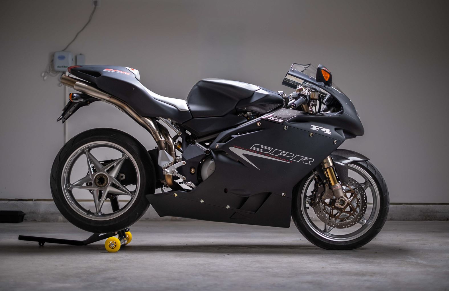 The SPR’s steel tubular trellis chassis was mated to a set of TIN-treated inverted Marzocchi forks, while its single-sided swing-arm was linked to a Sachs mono-shock — both of which were fully adjustable. Slowing the limited edition MV were six-piston calipers chomping down on a set of drilled 310mm rotors, complimented by a four-pot unit biting a 210mm disc in back. The SPR rolled along on a set of polished “five-star” aluminum wheels, juxtaposed with a matte black livery with grey saddle and red highlights with a silver “SPR” logo adorning the fairing.