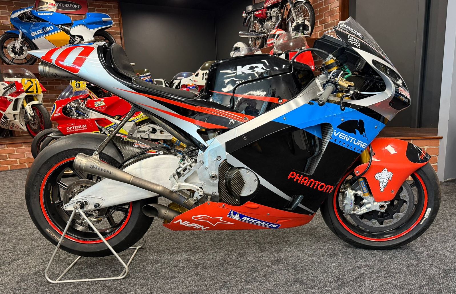The twin spar aluminum frame was designed by Kenny’s company GP Motorsports in the UK, and it was paired with Ohlins suspension, Marchesini wheels, Nissin brakes with carbon/steel rotors, 2D telemetry, and Akrapovic exhaust. Dry weight was approximately 320 pounds.