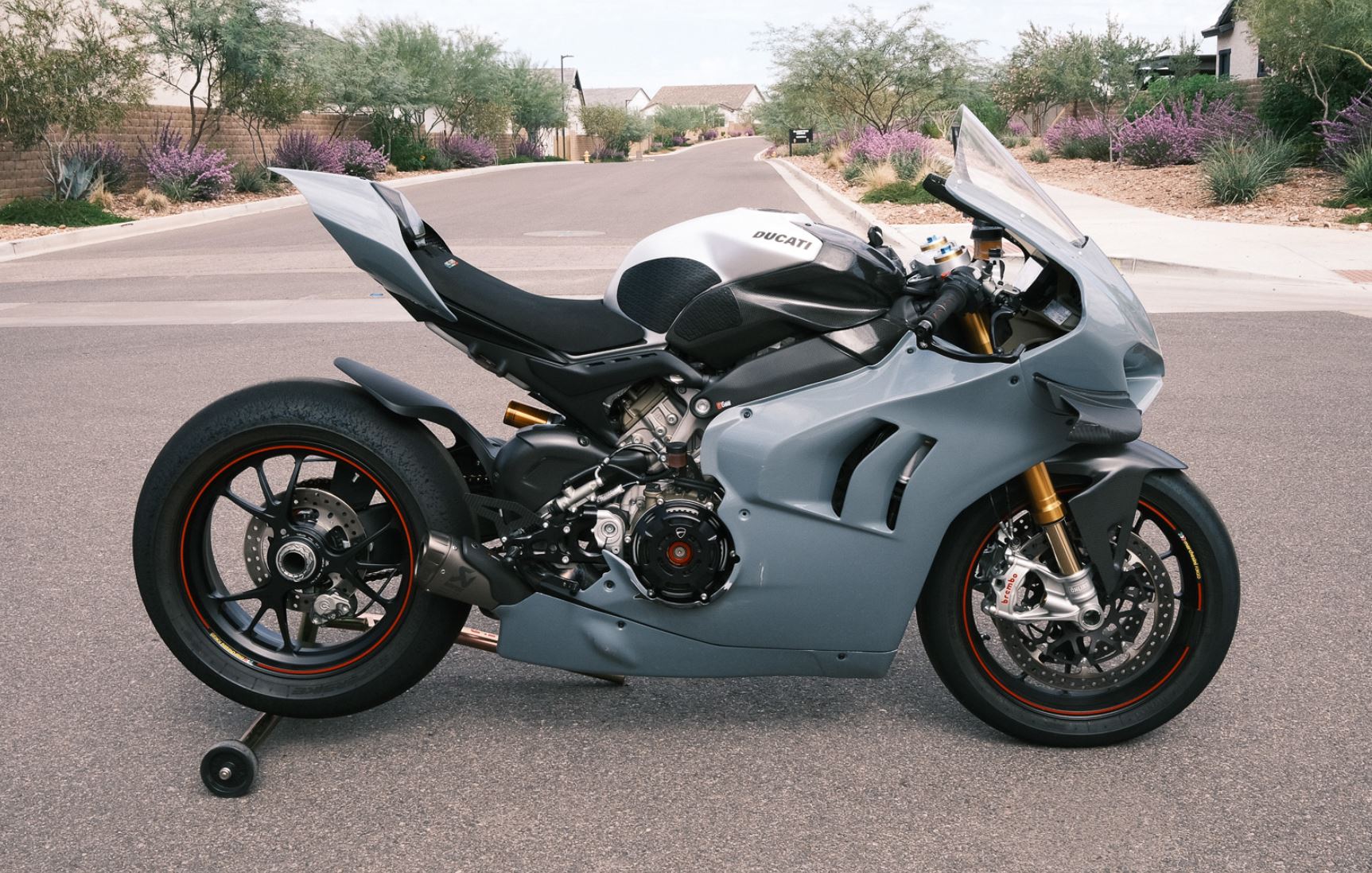 “Taking the opportunity to utilize this asset to sow a seed into a business opportunity I’ve seized. For sale is my 2019 Ducati Panigale V4 R — one of the finest, most visceral production superbikes ever built. This particular bike has been meticulously prepared by Boulder Motor Sports, yielding a strong build spec, with tasteful performance and aesthetic upgrades throughout while preserving all OEM parts and bodywork. The bike is currently fitted with Ducati CF race fairings, refinished in Nardo Grey. It has 1,224 original miles and is a riot to ride. Such a masterpiece to behold and experience, whether sitting in the garage or pushing the limits out around the track! This V4R is the real deal; a true weapon and gorgeous to boot. Thank you for your interest.”