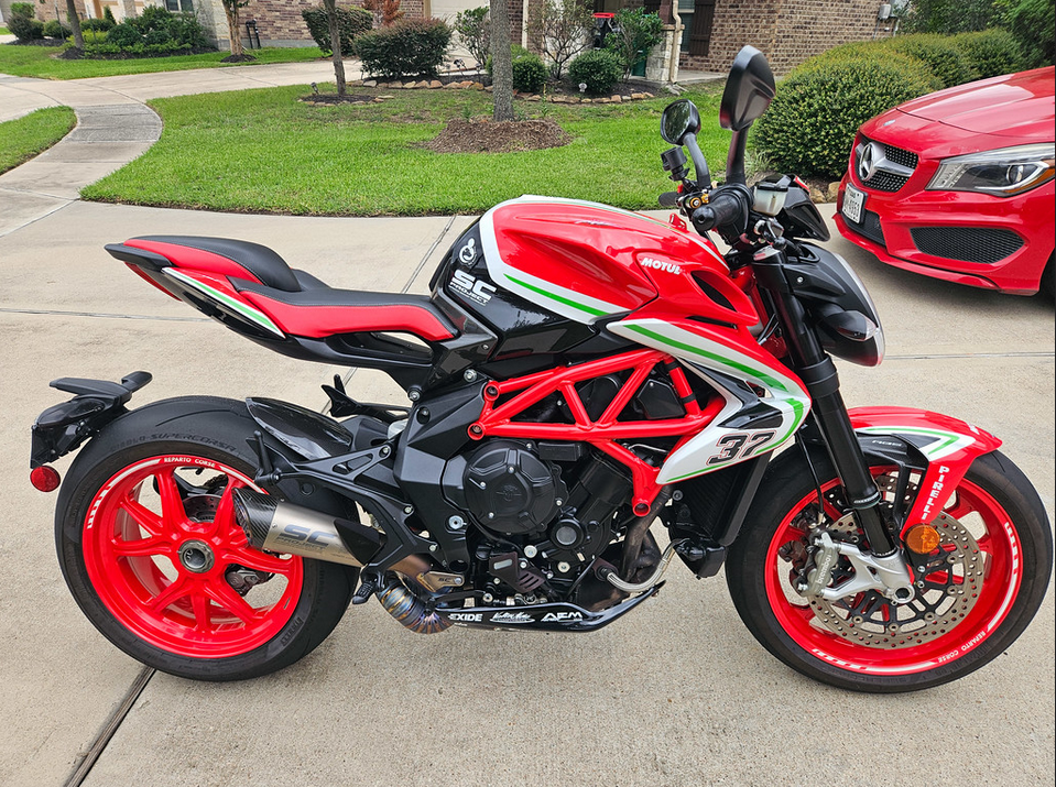 In 2017, MV Agusta gave the Brutale a special RC (Reparto Corse) model just like they had done with their sport bikes. The limited edition received a SC-Project titanium exhaust (boosting power output to 150 bhp @ 12,800 rpm), extra carbon fiber bodywork, RC-specific forged wheels, and vibrant RC-specific graphics adorned with 37 to celebrate the number of world championship constructors’ titles won by the Varese based firm.
