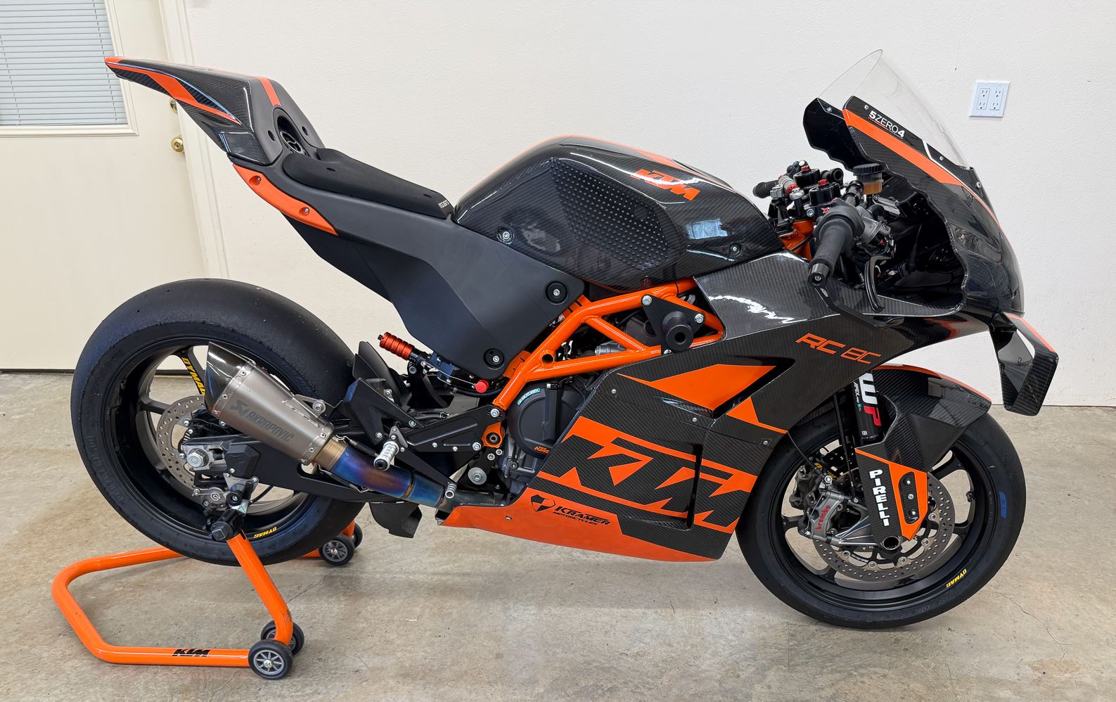 “The KTM RC 8C is an ultra-lightweight, bespoke track weapon designed with one simple purpose – to decimate lap times and stamp orange authority on the starting grid. It is hand-built and boasts factory racing levels of premium componentry, from Dymag UP7X forged aluminum wheels (with quick change assembly and axle that allows wheels to be swapped out without disassembling the brakes), Pirelli Diablo Superbike racing slicks, and the very best components from Brembo’s high performance component range (19RCS Corsa Corta radial master cylinder and Stylema front calipers grabbing 290mm fully floating brake disks with aluminum rotor carriers and titanium brake caliper screws).”