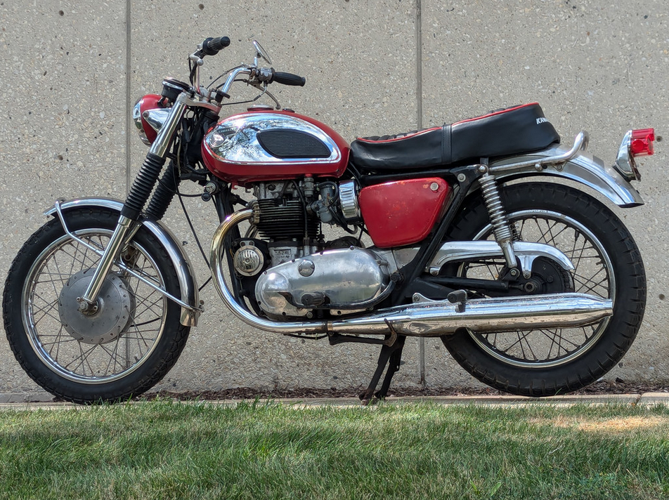 The seller has performed: Oil change and sump screen cleaning, recently installed AGM battery, carburetor cleaning. The seller states “It is a running project, definitely not “turn key”, and sold absolutely as is. It was stored over 30 years until just recently, and still needs work prior to any long rides… A very rare pre-unit transmission Kawasaki.