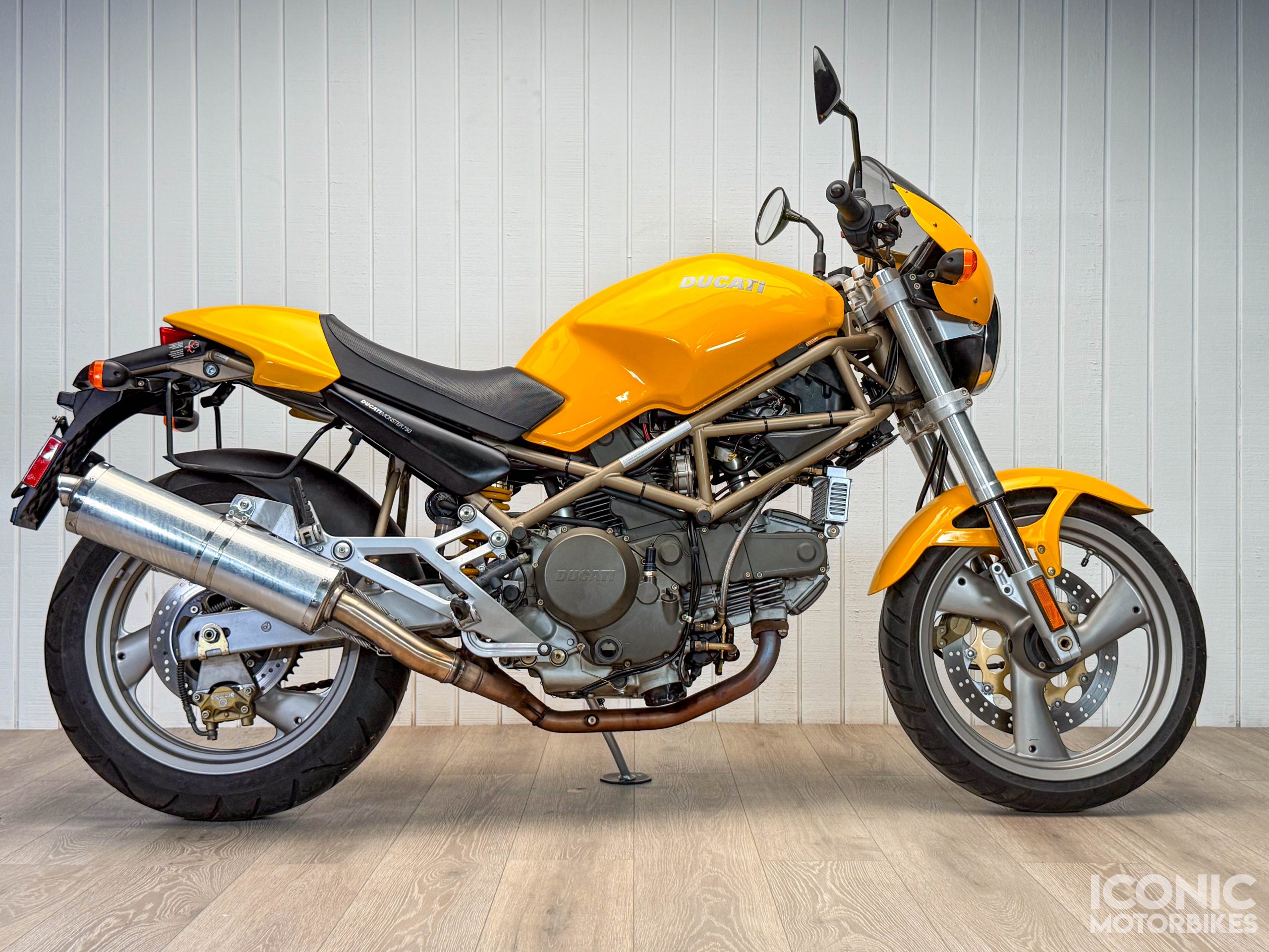 In 1996 Ducati introduced the Monster 750. Filling the gap between the Monster 600 and 900, the Monster 750 uses the 750SS engine in an 888 derived frame and SS suspension package, five speed gearbox and single front disc.