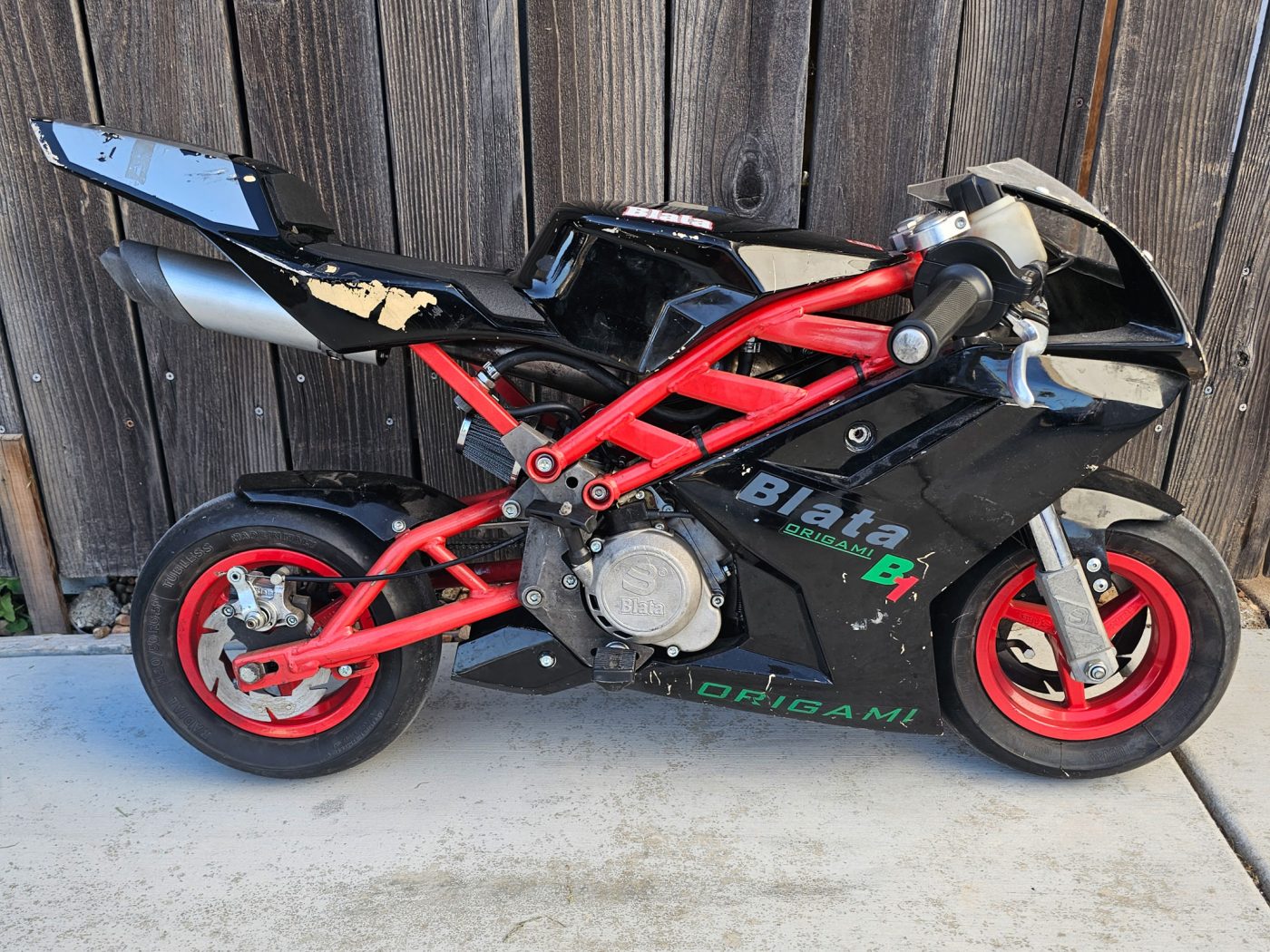 Over the years, Blata has manufactured everything from scooters to pocket bikes to 125cc enduros. The Origami B1 was first released in 2005 and was the company’s fastest mini bike available at the time. The little water-cooled, two-stroke, single-cylinder engine had a displacement of 39cc, produced 14hp, and could reach speeds upwards of 50 miles per hour.