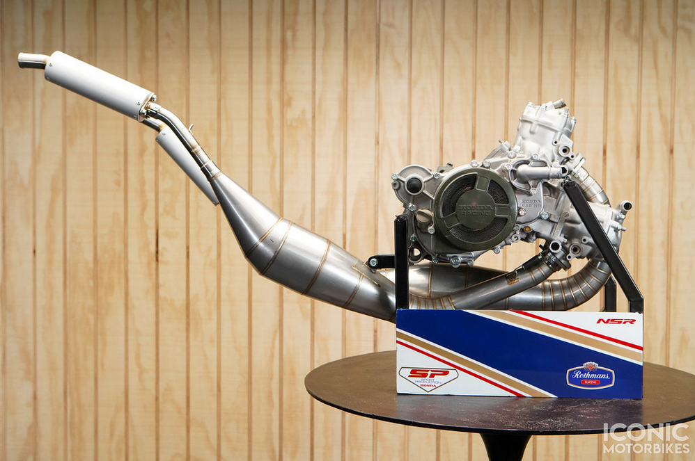 All of the engine hardware is either new OEM Honda or re-zinced. The engine stand is powder coated and was then custom painted in a mix of the 1992 and 1994 MC21/28 Rothmans liveries. The pipes can easily be removed in a few minutes to make it easier to move or display. I only made two of these and this is the only one I did in the Rothmans colors, I will be keeping the 2nd one.”