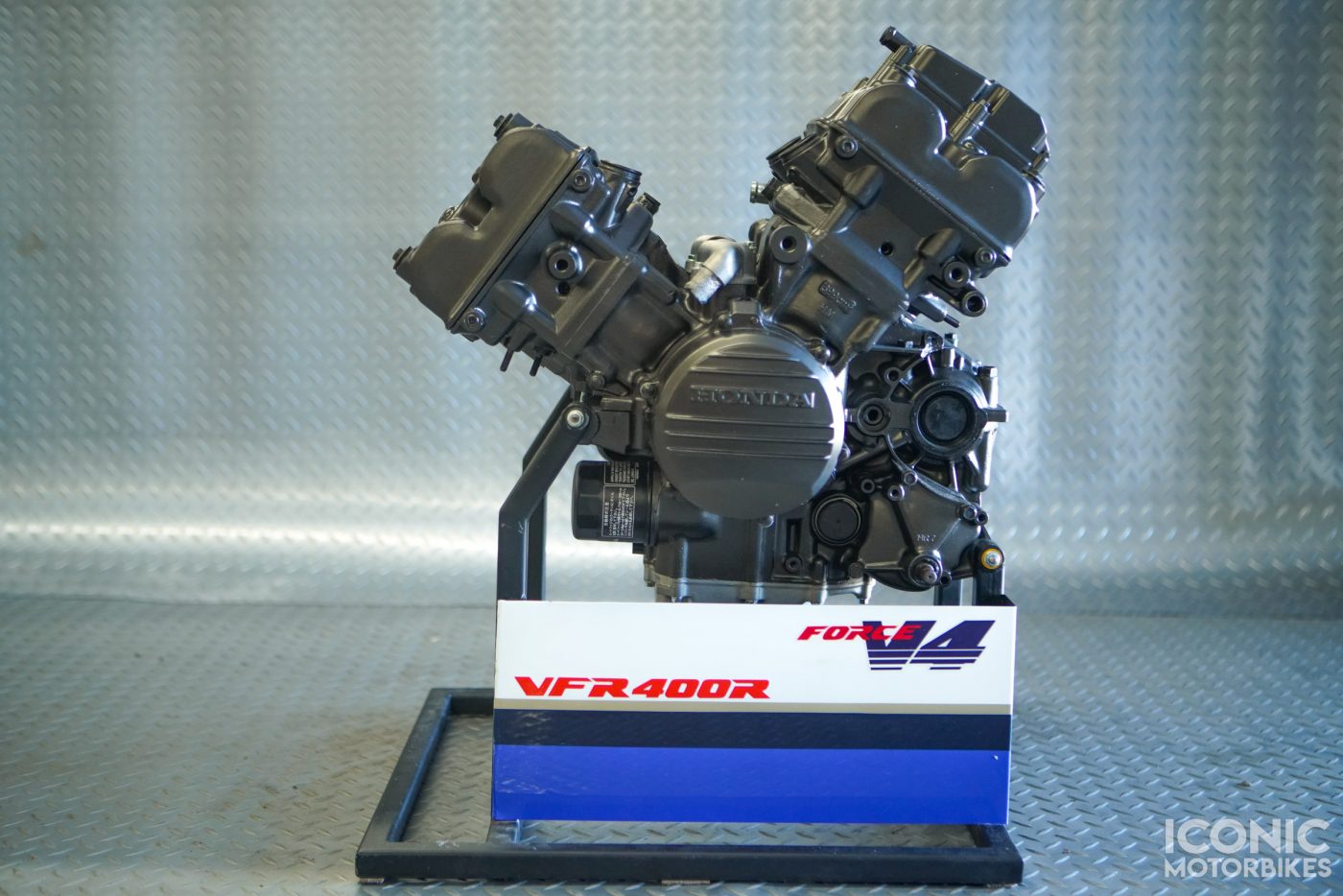 The display engine was sent to Iconic from Japan. It measures 25″x21″x18″ and weighs approximately 60lbs. Per the seller, “Parc Ferme MotoArt display engine. This is an actual NC30 engine, no internals, can not be made to run in the future, for display only. Comes mounted on a specially painted Parc Ferme NC30/35 engine work stand. It can be used with a standard left exit exhaust system for display if desired.”