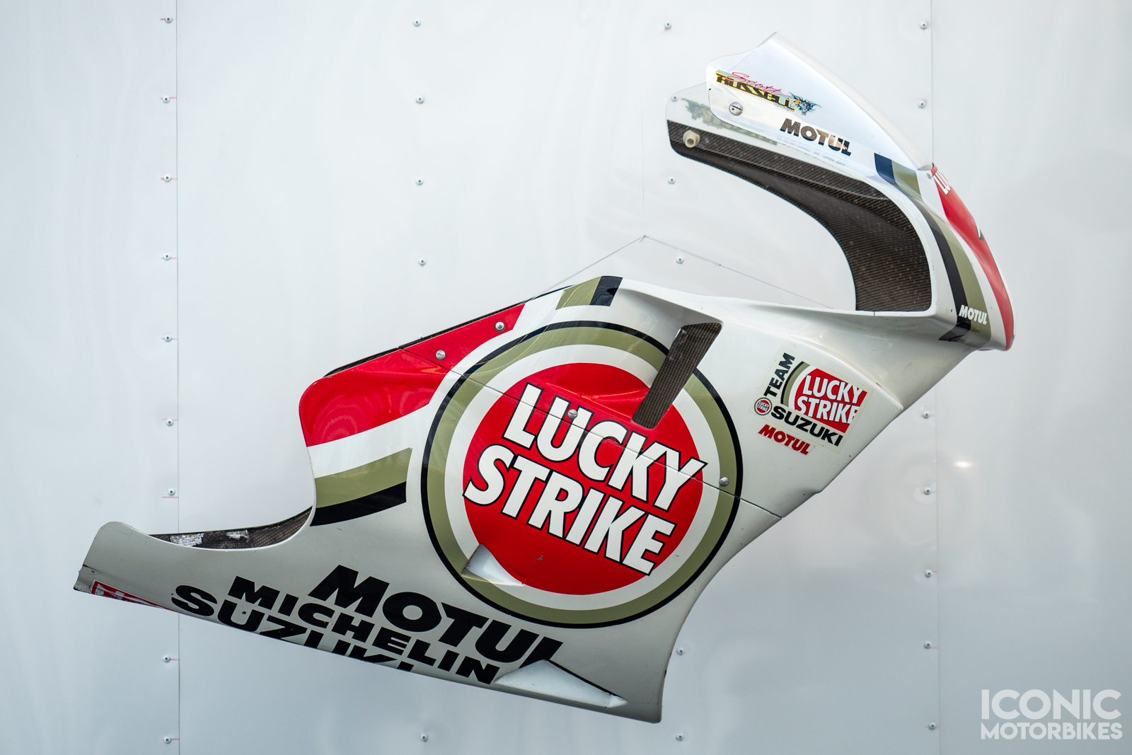 If you’ve been following Iconic for any time, you’ll know that we’re huge fans of Scott Russell. We’ve auctioned off several of his Shoei replica helmets, but today we’re pleased to offer you a set of RGV500 fairings from his time with Team Lucky Strike Suzuki.